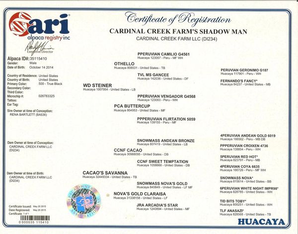 Male Huacaya, Cardinal Creek Farm's Shadow Man, Left